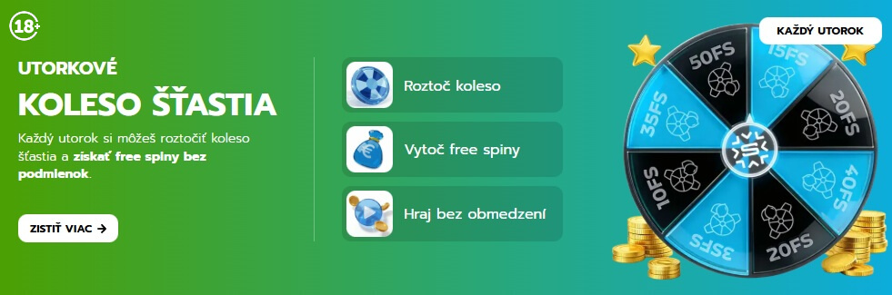 Každý utorok a počas vybraných sviatkov a iných špeciálnych dní vám dá Slovmatic možnosť si 1-krát zatočiť na tomto kolese a získať až do 50 free spinov zadarmo, v niektoré dni aj viac. Bez nutnosti predchádzajúcich stávok. Bez skrytých podmienok.